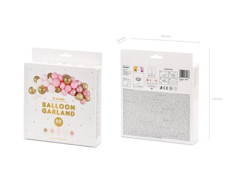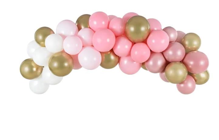 60 balonów ((10 Glossy w kolorze złotym, 10 pastelowych w kolorze Pastel Pink, 10 metalizowanych w kolorze różowego złota, 13 pastelowych w kolorze rumianoróżowym i 17 metalizowanych w kolorze białym)