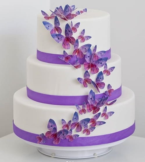 Motylki waflowe to efektownie wyglądająca gotowa dekoracja na torty i ciasta.Można ją położyć na płasko lub uzyskać efekt 3D składając skrzydełka. Motylki są wycięte, wyjmujesz z pudełka i dekorujesz wypieki.