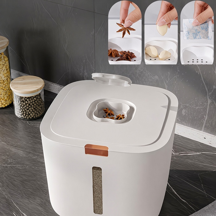⭐️ Szczelna konstrukcja pomaga chronić zawartość przed wilgocią, kurzem i dostępem owadów, dzięki czemu produkty są lepiej zabezpieczone na co dzień. Pokrywa została wyposażona w mały schowek na pochłaniacz wilgoci lub naturalne dodatki ochronne, takie jak anyż, czosnek czy saszetka osuszająca, które można umieścić oddzielnie od przechowywanej żywności.