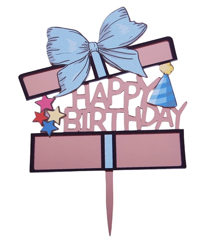 Topper akrylowy Happy Birthday RÓŻOWE ZŁOTO NIEBIESKA KOKARDA