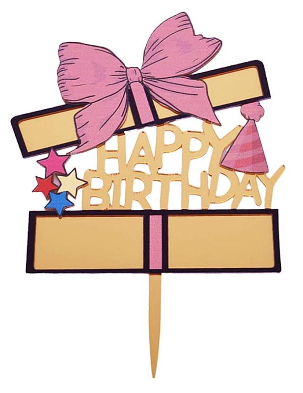 Topper akrylowy Happy Birthday ZŁOTY RÓŻOWA KOKARDA