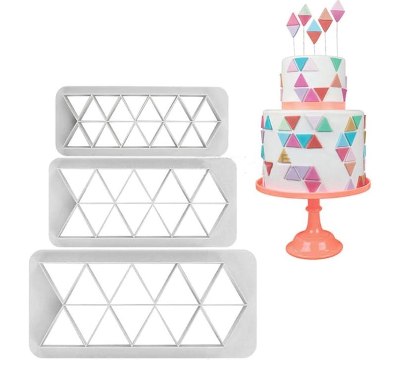 Zestaw trzech wykrawaczy do masy cukrowej - trójkąty, dzięki tym foremką z łatwością wykroisz z lukru plastycznego kilkadziesiąt wzorów w trzech wielkościach. Ozdoby możesz później ułożyć np. na bok tortu tworząc wspaniały kolorowy wzór.